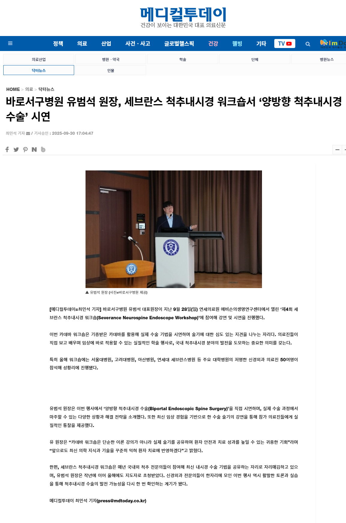 [¸ÞµðÄÃÅõµ¥ÀÌ] ¹Ù·Î¼±¸º´¿ø À¯¹ü¼® ¿øÀå, ¼¼ºê¶õ½º ôÃß³»½Ã°æ ¿öÅ©¼ó¼ ¡®¾ç¹æÇâ ôÃß³»½Ã°æ ¼ö¼ú¡¯ ½Ã¿¬