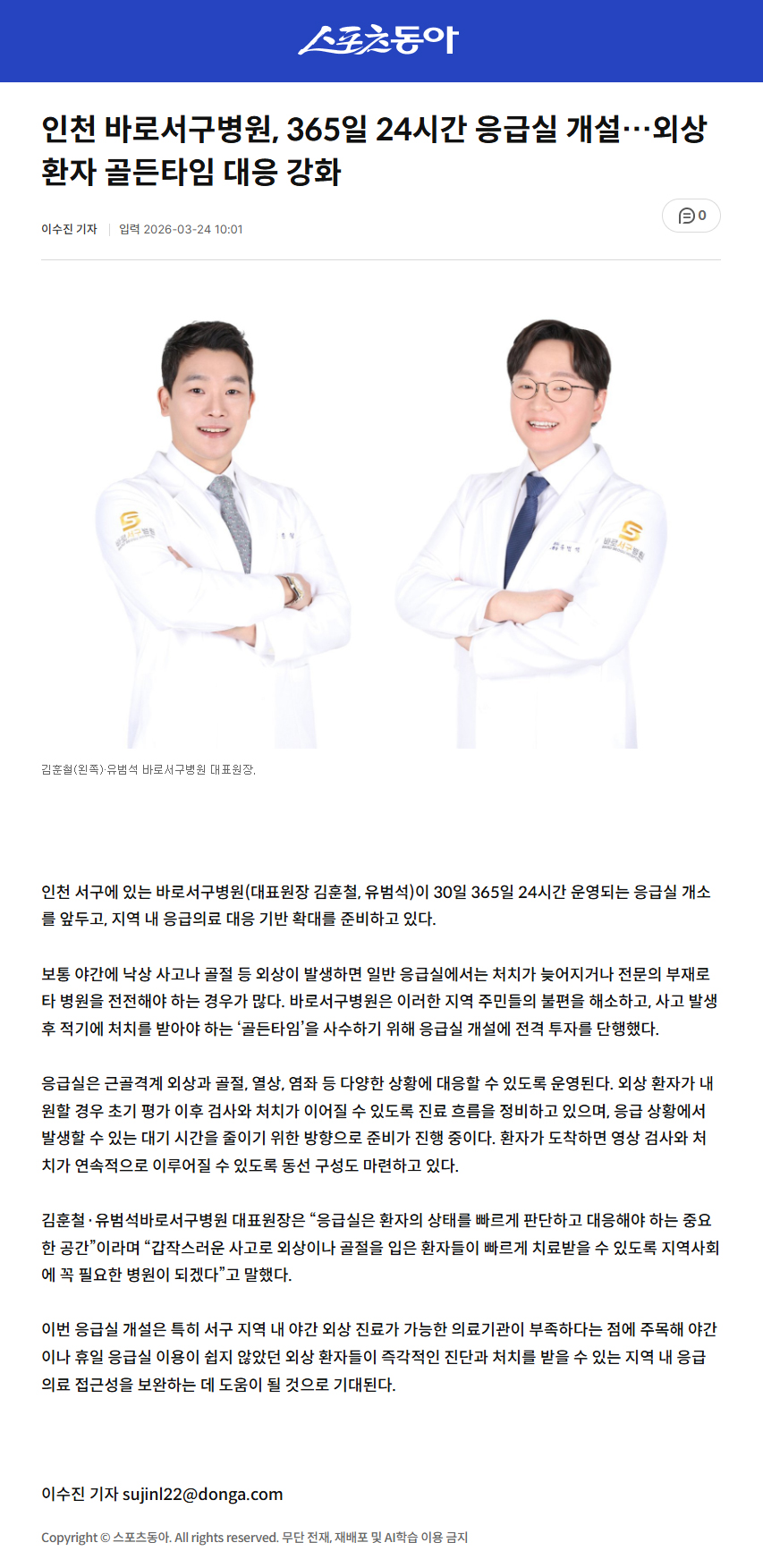 [½ºÆ÷Ã÷µ¿¾Æ] ÀÎõ ¹Ù·Î¼±¸º´¿ø, 365ÀÏ 24½Ã°£ ÀÀ±Þ½Ç °³¼³¡¦¿Ü»ó ȯÀÚ °ñµçŸÀÓ ´ëÀÀ °È